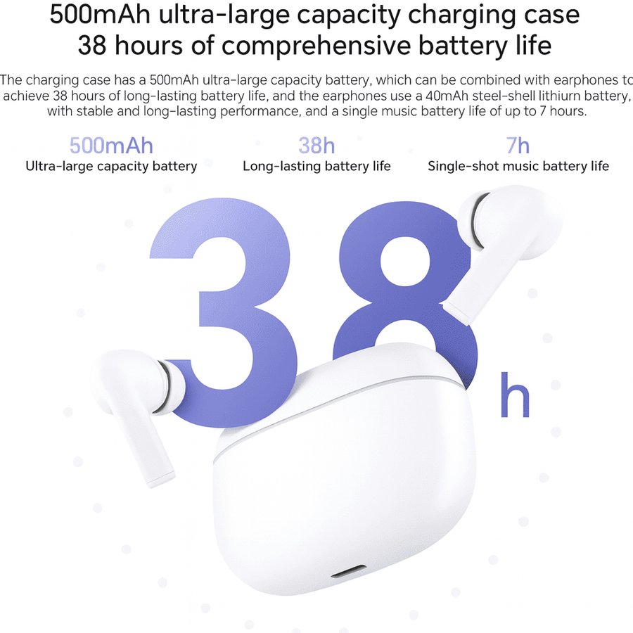 - علبة شحن بسعة 500mAh تمنحك حتى 38 ساعة استخدام.