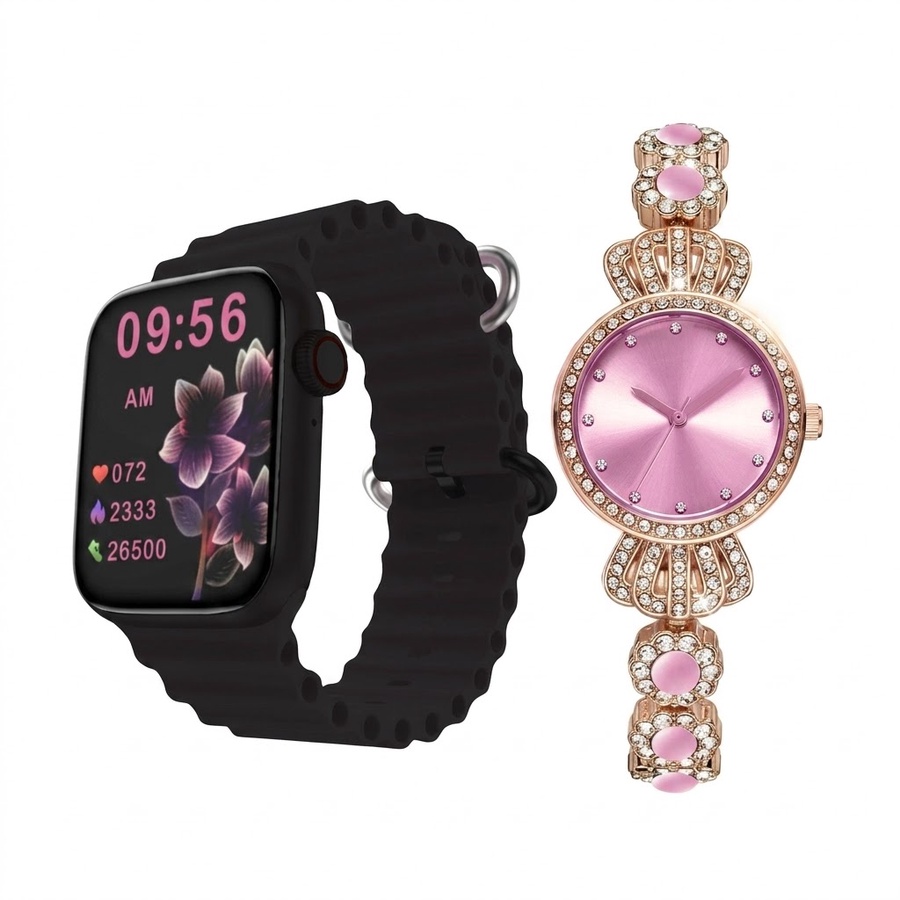 - الساعة الكلاسيكية المرصعة: ساعة يد معدنية باللون الذهبي الوردي